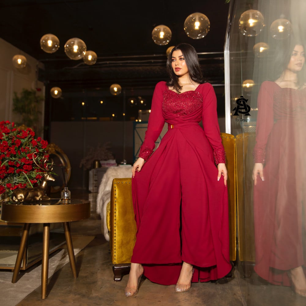 جمبسوت كريب احمر مزين بشك في الصدر والظهر وأطراف الاكمام